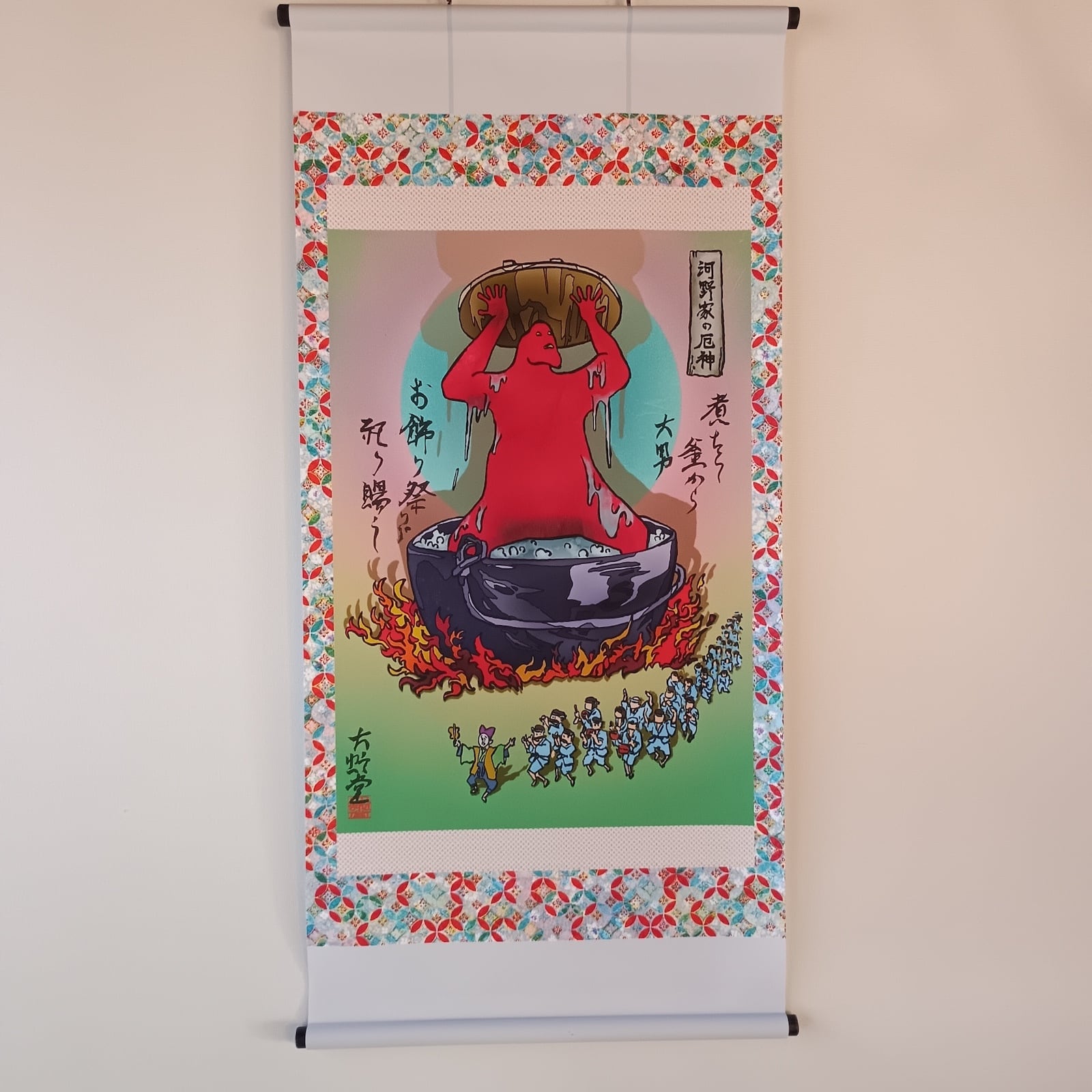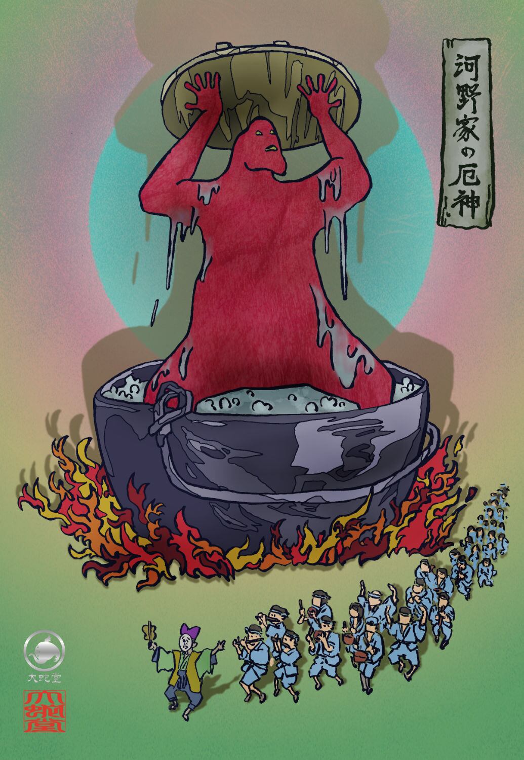 と、釜の中から太く大きな両腕が厚い蓋をぎゅっと差し上げ、大入道のような大男が仁王立ちに釜の中に立ち上がり「おれは厄神だぞ」と叫んだ。