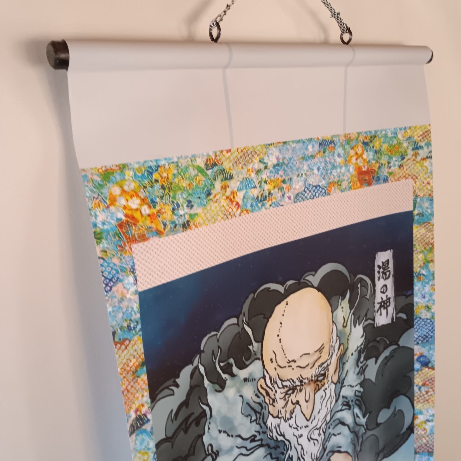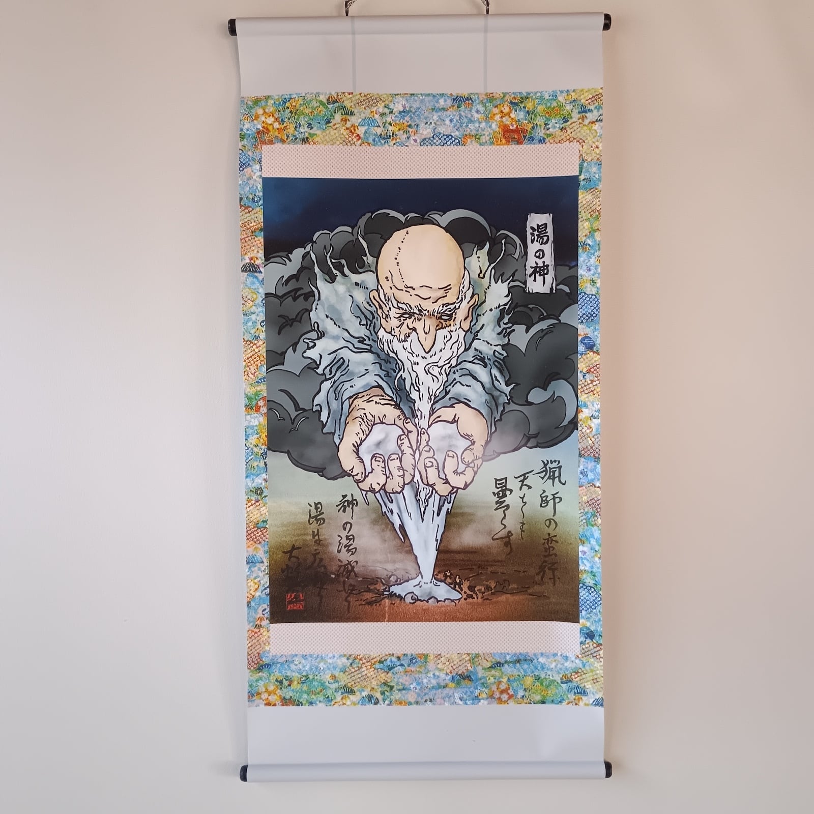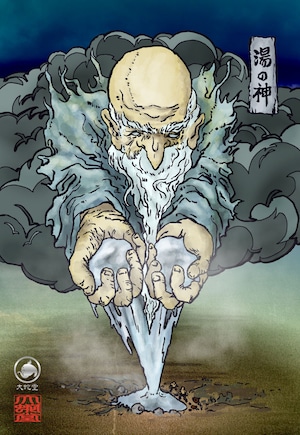 すると神が怒ったのか天がにわかに曇り、東天から黒雲が近づき湯の神の上にくると白髯が膝に達する仙人が現れ湯を手ですくい西北に向かって飛び去った。
