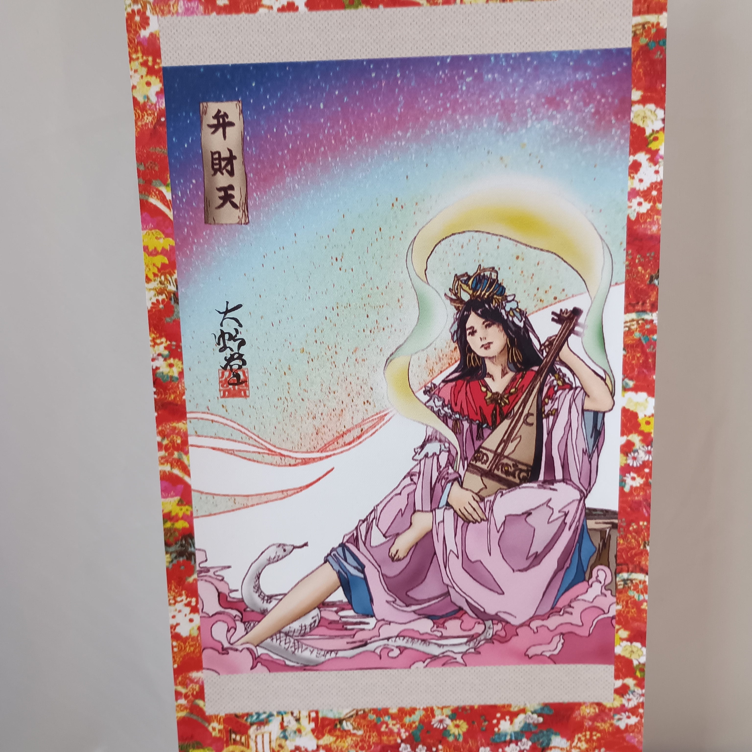 市杵島姫命の別の姿ともされる。天女姿で琵琶をもつのは日本独自のものとも言われる。