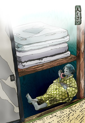 驚いた男は近所の人たちと相談して、押入れの戸をあけてみんなで捕らえて引きずり出した。
