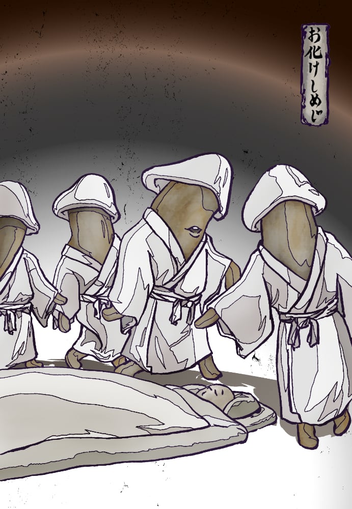 ある晩、和尚が床に入ると白い笠と白い着物を着た者たちがぞろぞろと現れ、寝床の周囲をぐりぐりぐりぐりと回り始めた。和尚が怖いながらも眺めていると、ほとんどの者たちは終始無言で回っては帰っていく中、一人だけ「塩と味噌 おっかねえ 塩と味噌 おっかねえ」と唱えている者がいた。