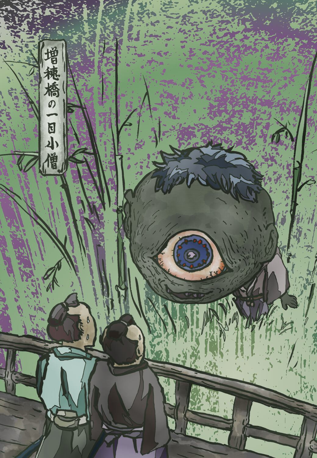 Hanzaemon Inoue and Yohei Ichikawa passed this edge at night. A boy with one eye emerged from the bamboo grove. Hanzaemon drew his sword and tried to cut him.But Yohei stopped it. "You don't have to kill him. If you look down from above, the hitotsume-kozou will disappear." They glared at the monster from the bridge. Then the monster disappeared.