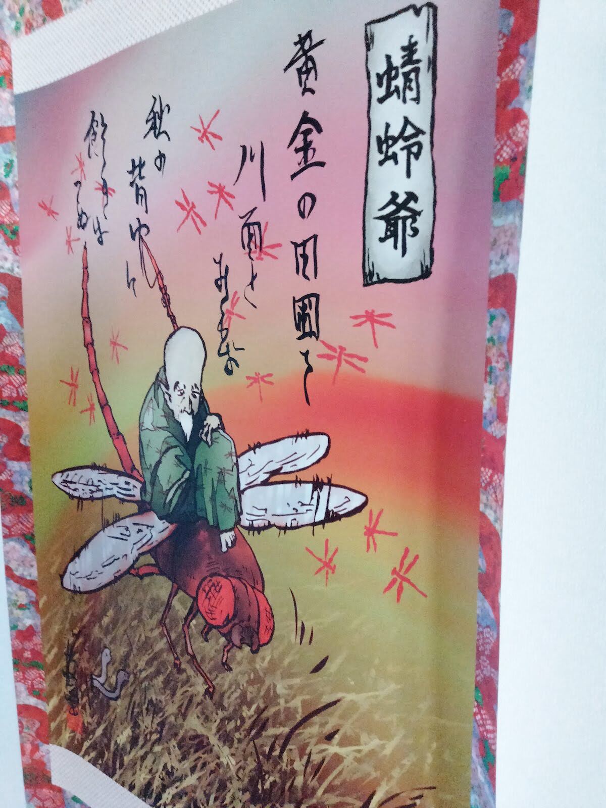 地元の木工作家が秋の天気の良い日に黄金に輝く田んぼを見ていると、飛び回るアキアカネの群れの中に奇妙なトンボをみた。そのトンボは上にお爺さんが乗っており、肩には釣竿を担いでいたという。